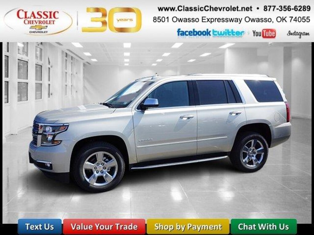 NAV, 3rd Row Seat, Heated Leather Seats, Tow Hitch, 4x4, Quad Seats, Alloy Wheels. Premier trim. Warranty 5 yrs/60k Miles - Drivetrain Warranty; READ MORE!======KEY FEATURES INCLUDE: Leather Seats, Third Row Seat, Navigation, 4x4, Quad Bucket Seats MP3 Player, Privacy Glass, Remote Trunk Release, Keyless Entry, Child Safety Locks. ======EXPERTS RAVE: Edmunds.com's review says Inside the 2017 Chevrolet Tahoe, there's a wealth of space for passengers in the first two rows of seats, and materials quality is above average for the class.. ======WHO WE ARE: Please call (877) 356-6289 ask for New Car Sales. Classic Chevrolet in Tulsa, OK, where a handshake still matters, also serving Owasso, OK and Muskogee, Classic Chevrolet where shopping for the best price on a vehicle is easy everyday. Since opening our doors, Classic Chevrolet has maintained our solid commitment to our customers, offering a wide selection of cars and trucks and ease of purchase. Please confirm the accuracy of the included equipment by calling us prior to purchase.
