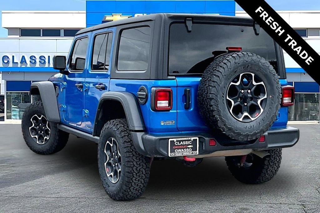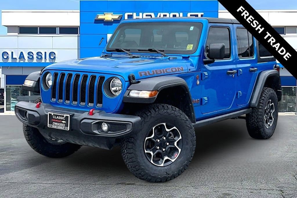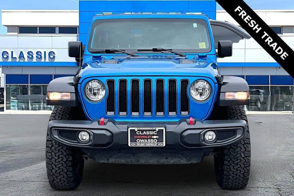 **4WD**, **ANDROID CARPLAY**, **APPLE CARPLAY**, **AUTO HEADLIGHTS**, **BLUETOOTH**, **HEATED SEATS**, **KEYLESS ENTRY**, **LOCAL TRADE**, **REAR BACKUP CAMERA**, **USB PORT**. Quick Order Package 22R Rubicon, 4-Wheel Disc Brakes, 4.10 Rear Axle Ratio, 9 Speakers, ABS brakes, Air Conditioning, Alloy wheels, AM/FM radio: SiriusXM, Apple CarPlay/Android Auto, Auto-dimming Rear-View mirror, Automatic temperature control, Aux Battery, Black 3-Piece Hard Top, Brake assist, Compass, Delay-off headlights, Driver door bin, Driver vanity mirror, Dual front impact airbags, Dual front side impact airbags, Electronic Stability Control, Emergency communication system: SiriusXM Guardian, Engine Oil Cooler, Freedom Panel Storage Bag, Front anti-roll bar, Front Bucket Seats, Front Center Armrest w/Storage, Front Differential Electronic Lock w/Axle Disconnect, Front dual zone A/C, Front fog lights, Front License Plate Bracket, Front reading lights, Fully automatic headlights, Garage door transmitter, Heated door mirrors, Illuminated entry, Integrated roll-over protection, Low tire pressure warning, Navigation System, No Soft Top, Non-Lock Fuel Cap w/o Discriminator, Occupant sensing airbag, Outside temperature display, Panic alarm, ParkView Rear Back-Up Camera, Passenger door bin, Passenger vanity mirror, Performance Suspension, Power door mirrors, Power steering, Power windows, Premium Cloth Low-Back Bucket Seats, Radio data system, Radio: Uconnect 4C Nav w/8.4 Display, Rear anti-roll bar, Rear reading lights, Rear Window Defroster, Rear Window Wiper/Washer, Remote keyless entry, Security system, Speed control, Split folding rear seat, Steering wheel mounted audio controls, Stop-Start Dual Battery System, Tachometer, Telescoping steering wheel, Tilt steering wheel, Traction control, Trip computer, Variably intermittent wipers, Voltmeter, and Wheels: 17 x 7.5 Machined/Painted Black.2023 Jeep Wrangler Rubicon 4WD 8-Speed Automatic 2.0L I4 DOHC Hydro Blue Pearl Coat